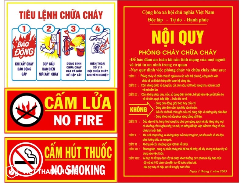 Bảng nội quy PCCC tiêu chuẩn thường đi kèm với tiêu lệnh chữa cháy, bảng cấm cửa, bảng cấm hút thuốc. Nội dung bảng quy định cụ thể về các biện pháp phòng cháy chữa cháy, những điều cần lưu ý để tránh nguy cơ cháy nổ, quy định khen thưởng và nếu phạt.